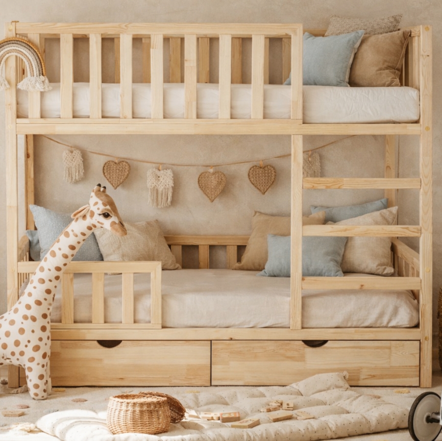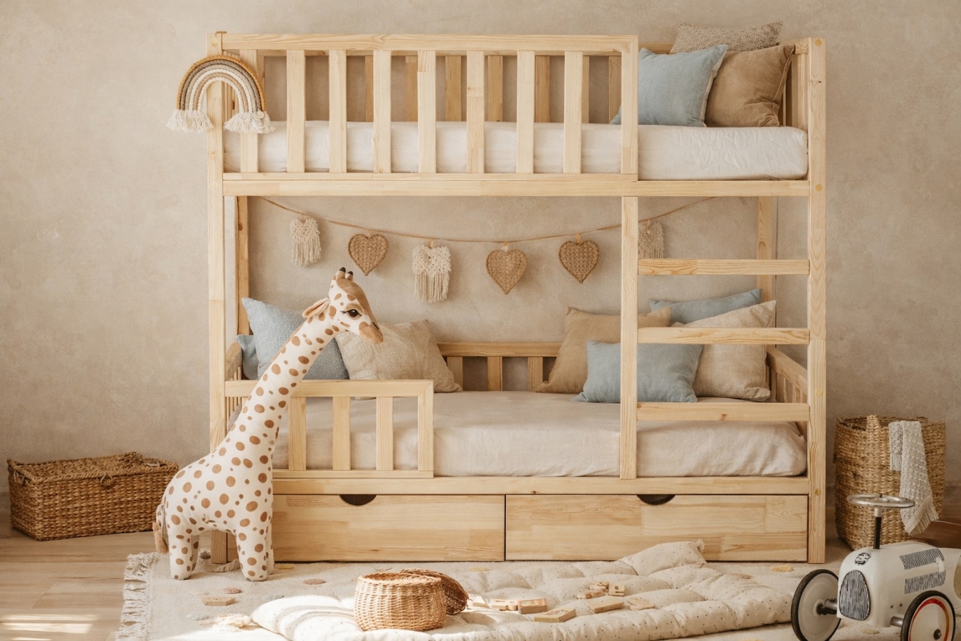 Wszystkie elementy łóżka i szuflady są wykonane z drewna, dno szuflad jest wykonane z płyty HDF.