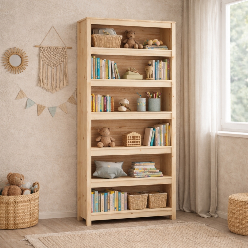 Otwarta konstrukcja regału sprawia, że książki, zabawki i dekoracje są zawsze w zasięgu ręki dziecka, jednocześnie ucząc samodzielności i organizacji przestrzeni. Regał doskonale sprawdzi się zarówno w pokoju przedszkolaka, jak i starszego dziecka – może pełnić funkcję biblioteczki, miejsca na gry, kosze z zabawkami czy ulubione dekoracje.
