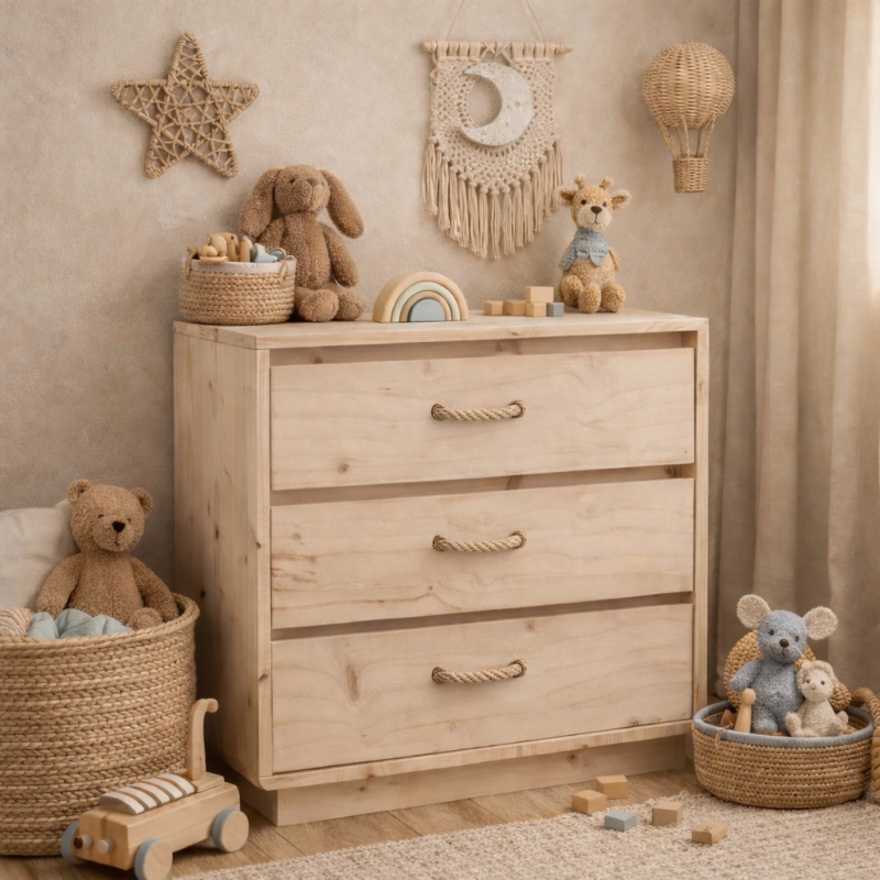 Szafka Scandi No.01 to kompaktowy mebel z litego drewna sosnowego, zaprojektowany jako naturalne uzupełnienie kolekcji Scandi Room. Prosta forma, trzy pojemne szuflady i sznurowe uchwyty sprawiają, że szafka doskonale sprawdzi się w pokoju dziecka, tworząc spójną i spokojną aranżację w stylu skandynawskim.