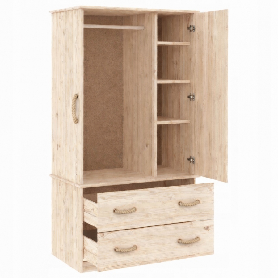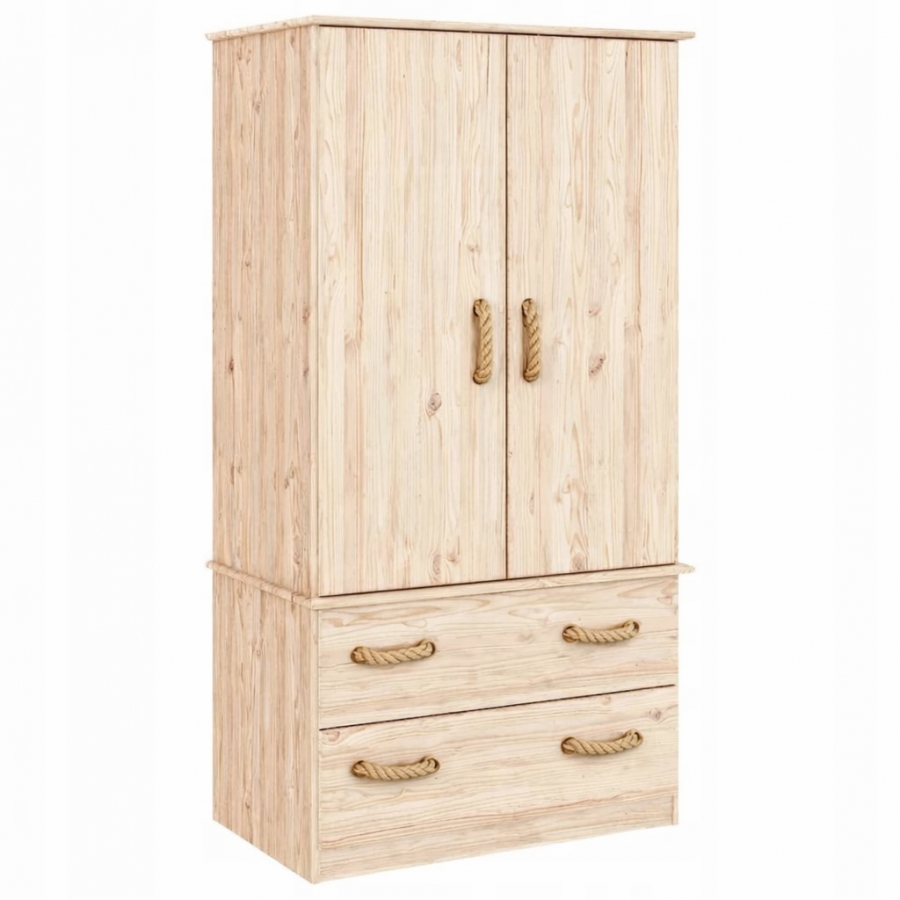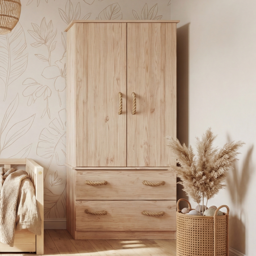 Szafa wykonana jest z naturalnego drewna w jasnym, ciepłym odcieniu, który doskonale wpisuje się w aranżacje dziecięcych wnętrz w stylu scandi, boho oraz natural. Charakterystyczne uchwyty ze sznura nadają jej lekkości i podkreślają rękodzielniczy charakter mebla.