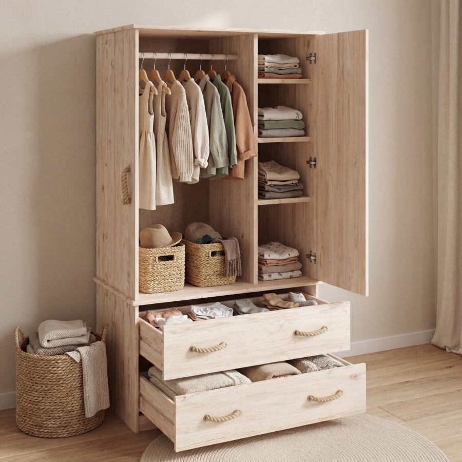 Dzięki uniwersalnej formie i neutralnej kolorystyce szafa Scandi No.04 pasuje zarówno do pokoju dziewczynki, jak i chłopca. To idealne rozwiązanie dla rodziców, którzy cenią naturalne materiały, ponadczasowy design i praktyczne rozwiązania.
