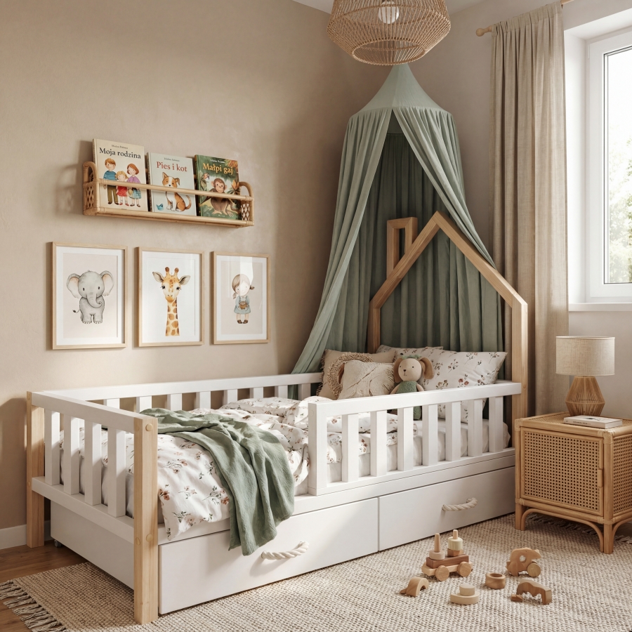 Wyjątkowe łóżko Mini Domek Scandi to połączenie funkcjonalności, bezpieczeństwa i niezrównanego uroku. Jego charakterystyczna konstrukcja z daszkiem i prostą ramą z drewna sosnowego tworzy harmonijną bazę dla dziecięcych snów i codziennych zabaw.